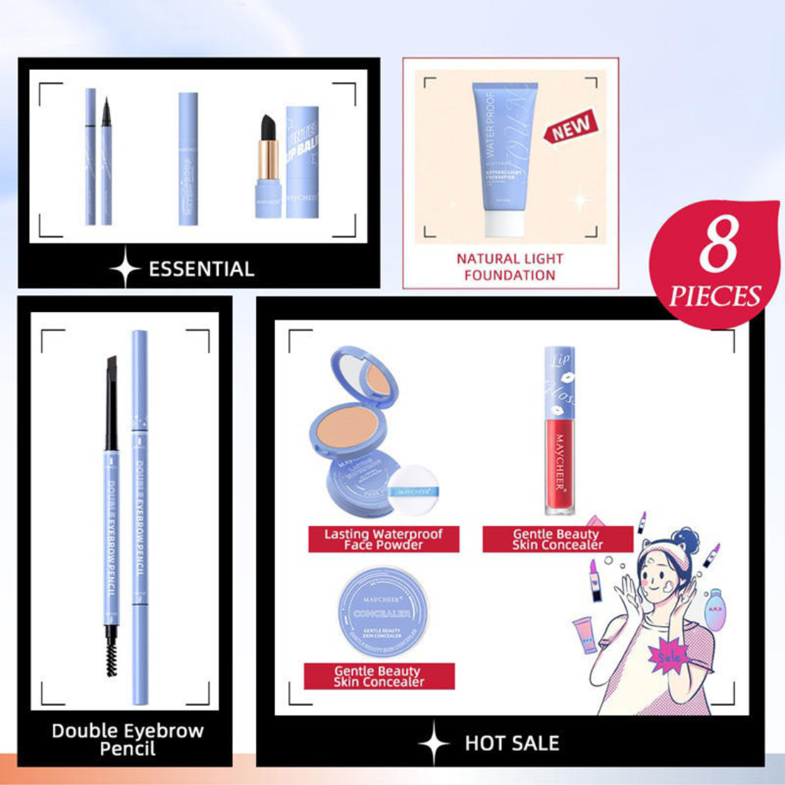 • Complete set: foundation, powder, two concealers, lipstick, mascara, double eyebrow pencil.